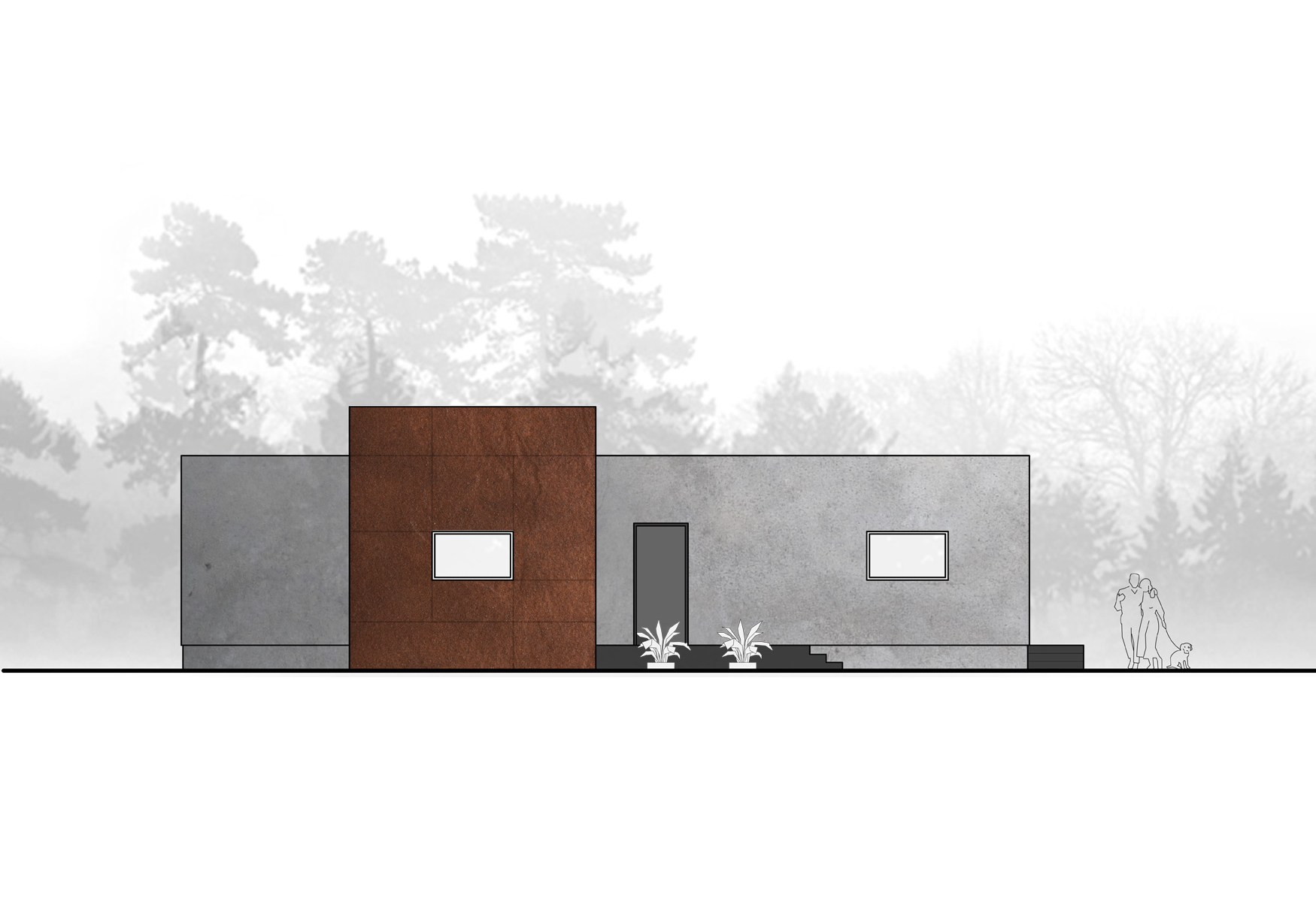 TAGI: dom nowoczesny, dom parterowy, dom z płaskim dachem, dom minimalistyczny, otwarta kuchnia, dom z tarasem, garaż wolnostojący, dom z kominkiem, dom ergonomiczny, projekt indywidualny domu, budynek niepodpiwniczony, dom murowany, w technologii tradycyjnej, stal corten, deski na elewacji