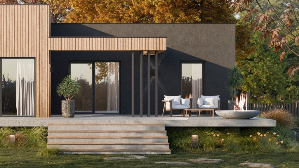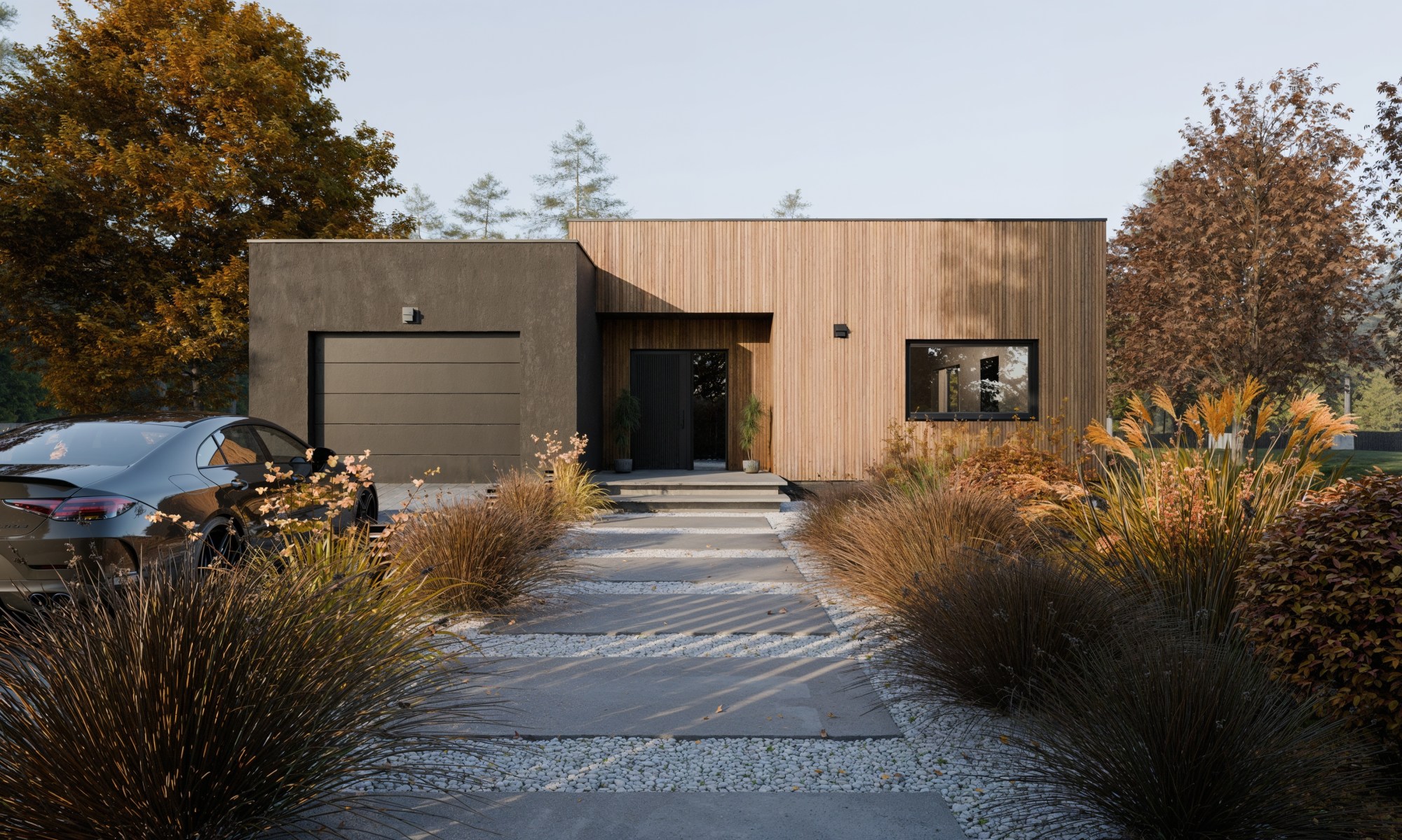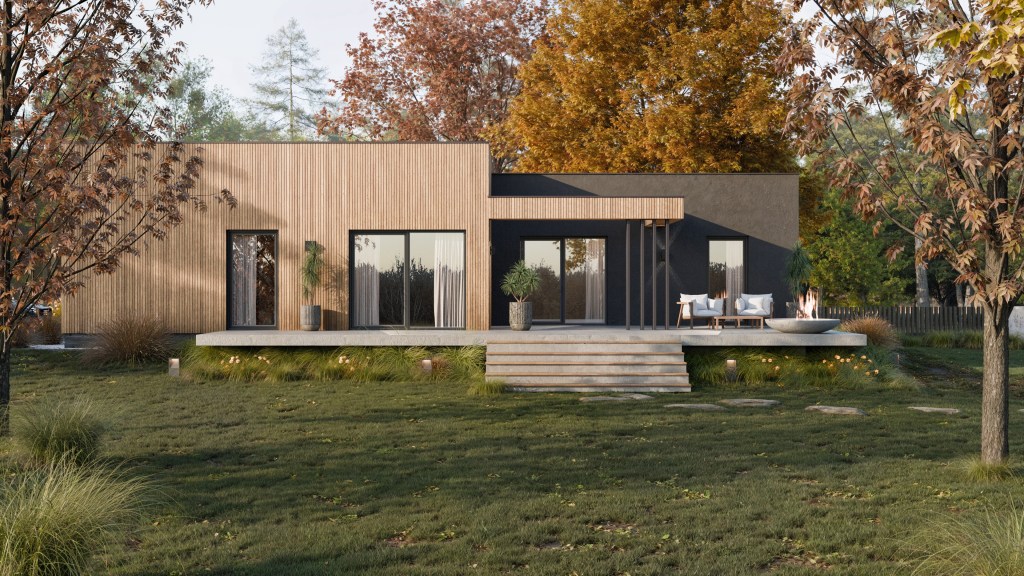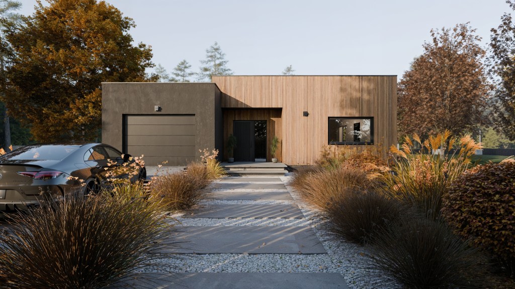 Działka z dużym spadkiem terenu i parterowy dom? Myślę, że udało nam się spełnić to marzenie. Minimalistyczna prosta elewacja, taras, który lewituje nad bujnymi trawami, naturalne materiały i dużo zieleni – brzmi jak przepis na idealne miejsce do życia!