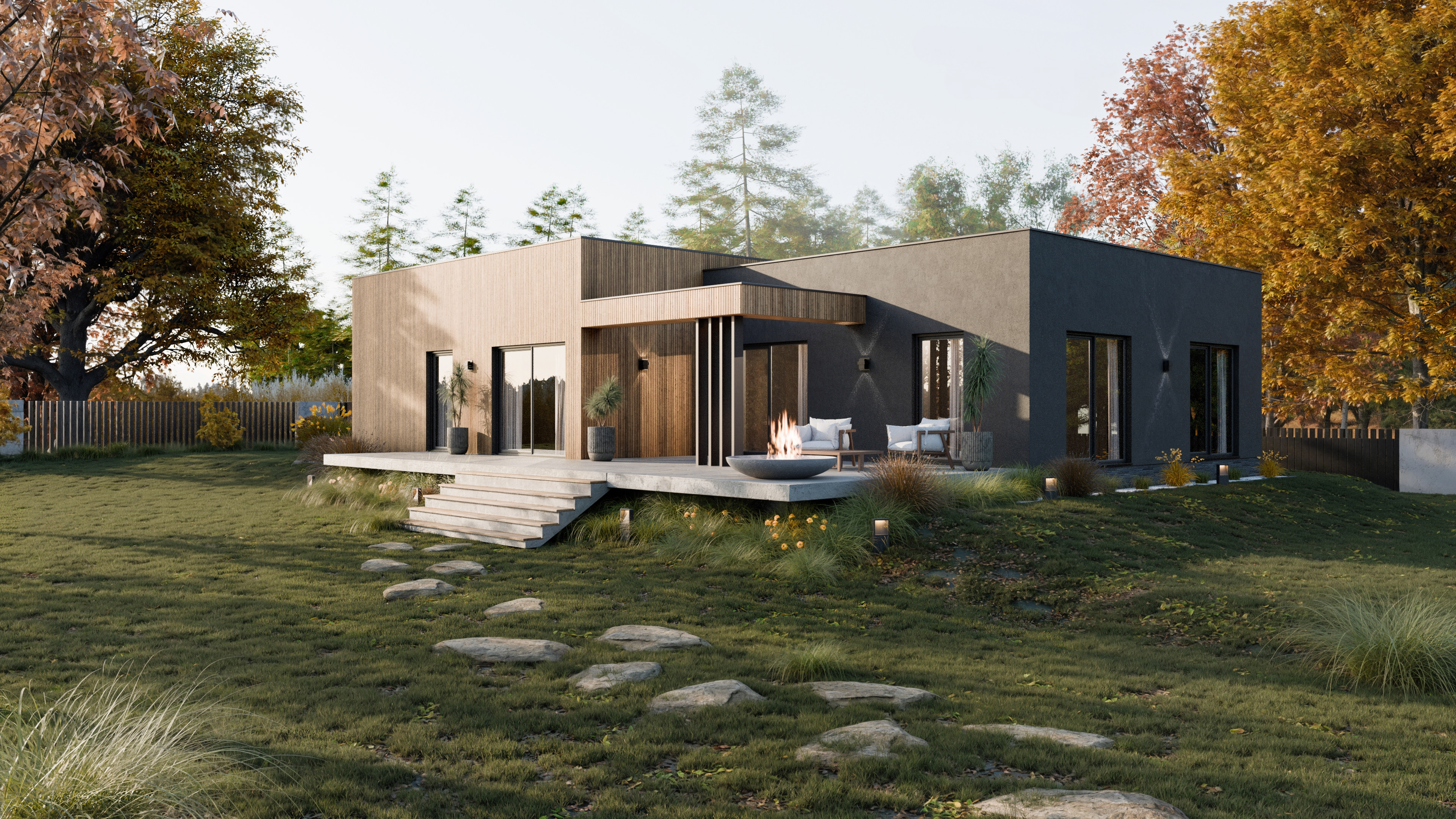 Działka z dużym spadkiem terenu i parterowy dom? Myślę, że udało nam się spełnić to marzenie. Minimalistyczna prosta elewacja, taras, który lewituje nad bujnymi trawami, naturalne materiały i dużo zieleni – brzmi jak przepis na idealne miejsce do życia!